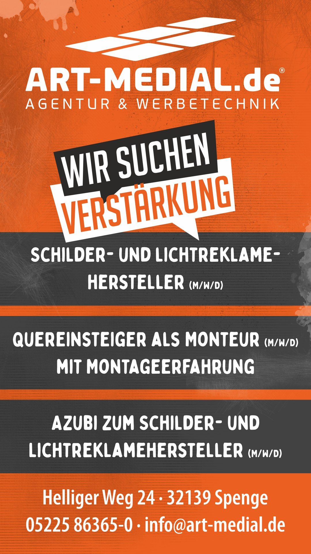 Bewirb dich noch heute bei uns, telefonisch, per Post oder per Mail: bewerbung∂art-medial.de